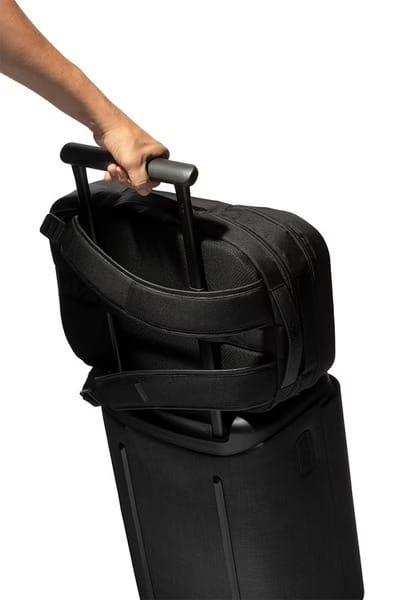 可放置水壺的側邊隱藏式口袋, 背面增加了行李箱拉桿固定帶可與行李箱搭配使用。